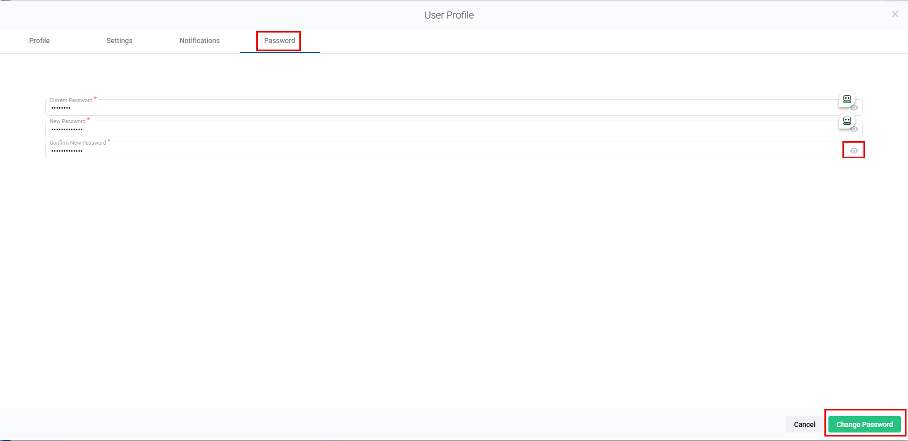 You can check your password by clicking on the eye icon on the right of each password line